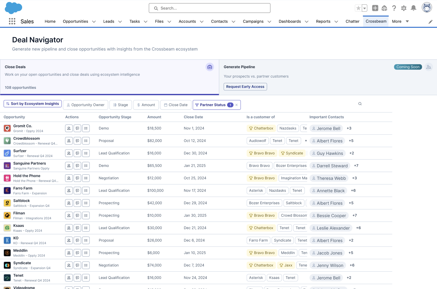 Designed for sales managers, individual sellers, growth and marketing managers, Deal Navigator enhances sales efficiency by leveraging Ecosystem Intelligence to prioritize deals and surface key partner insights.