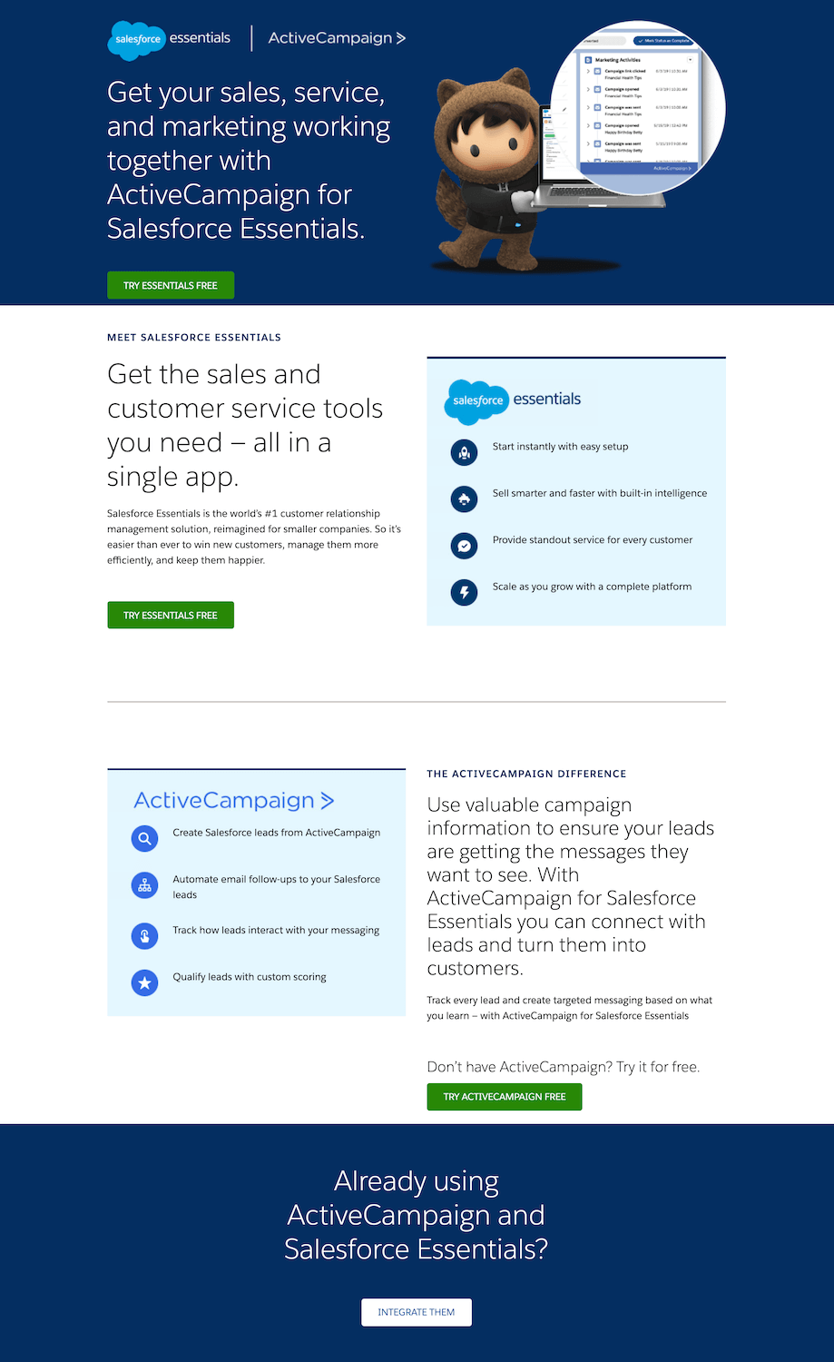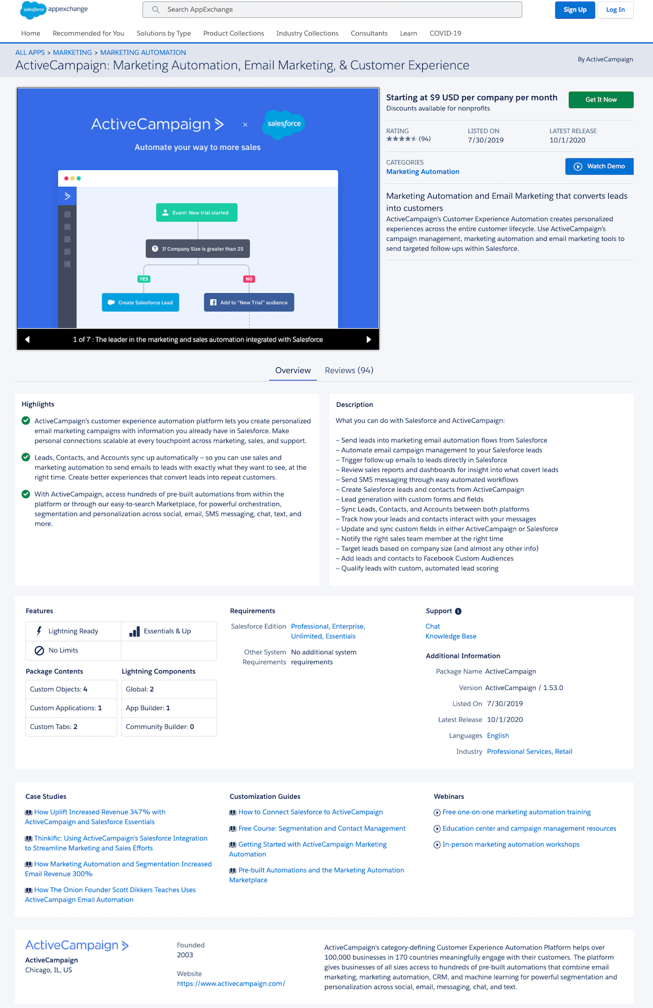 - Co-branded landing pages for potential integration adopters on ActiveCampaign and Salesforce’s websites (note: ActiveCampaign’s listing page doubles as their landing page)