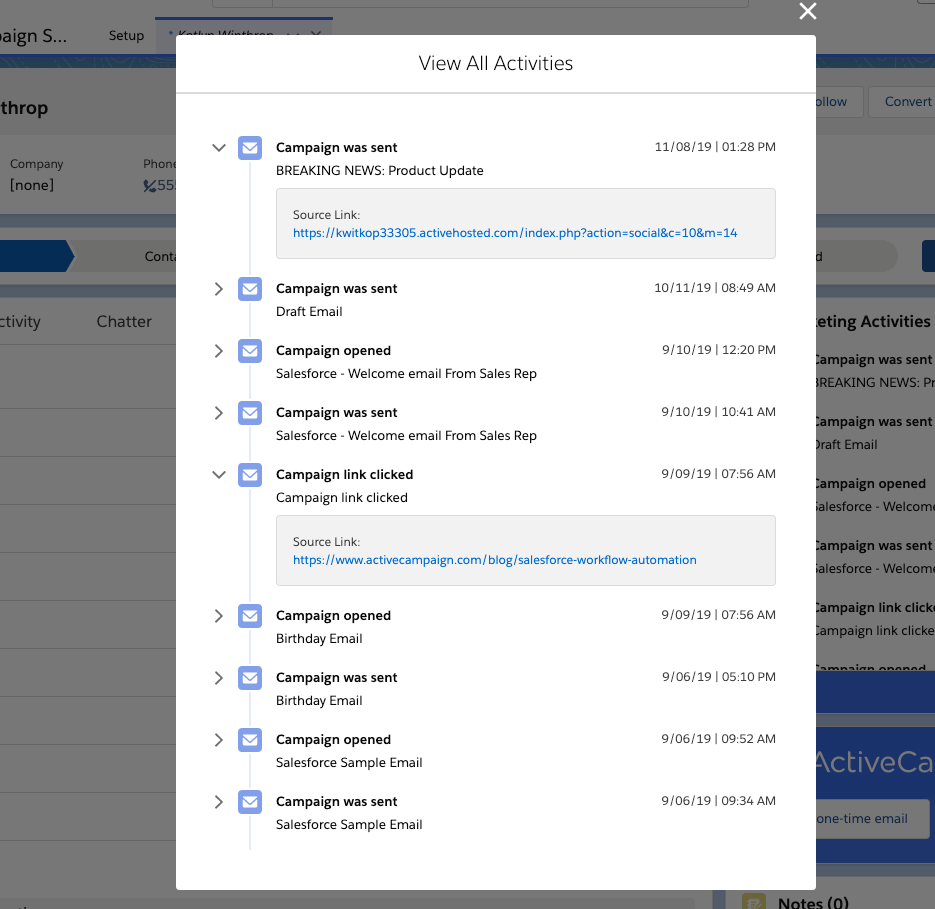 “We’re beginning to go deeper in how to expose each other’s brands on the platforms. In ActiveCampaign today, we have automation events or actions that are branded for Salesforce,” says Howe. “Likewise, inside Salesforce, you have an ActiveCampaign branded activity stream. You can see who’s opening your emails, what they’re doing on your website. All that tracking is getting exposed into Salesforce for sales reps. We’re branding those activities across the platform.”