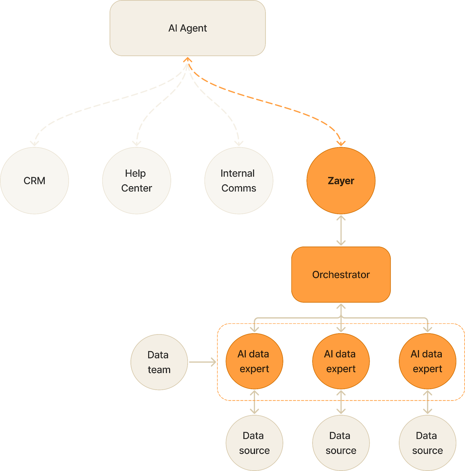 At least, that’s what would happen if we didn’t create Zayer to solve this. It gives any AI agent an entire team of data experts tailored to your data stack, allowing your agent to ask any question and get the answer, data and context it needs to carry out its work — no matter how wide ranging and autonomous it is.
