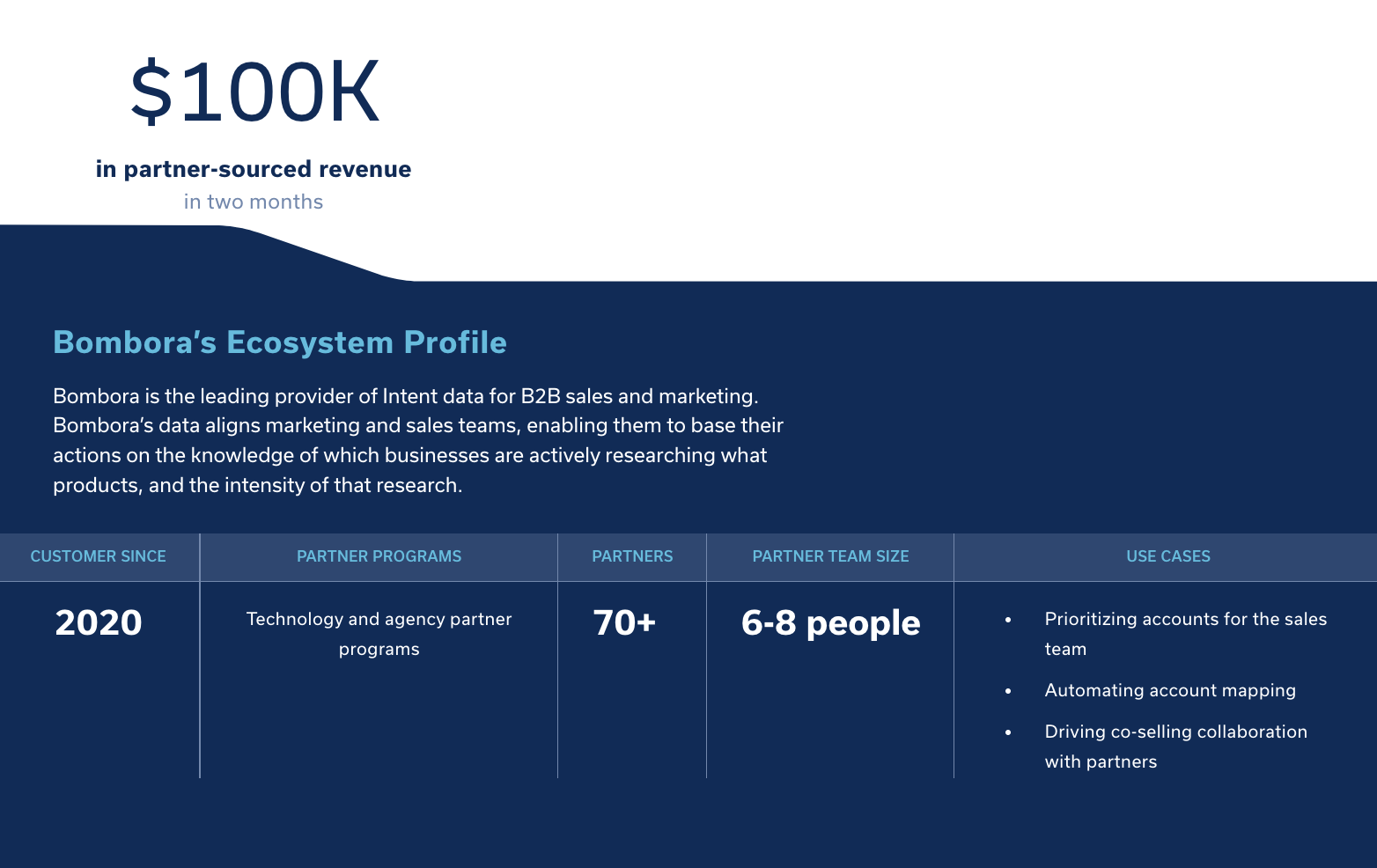 - Bombora’s customers + partner’s customers (to evaluate new partners and determine if a partnership discussion is worth exploring or to strategize upselling or cross-selling motions).
