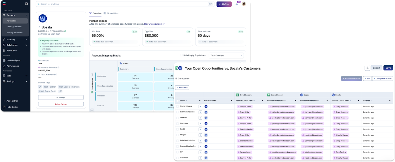 At the core is account mapping: a bird’s-eye view of how your pipeline, customers, and prospects overlap with those of your partners. This visibility lets you and your reps quickly spot where a stalled deal might benefit from a partner introduction or where a prospect is already a happy customer of your ecosystem.