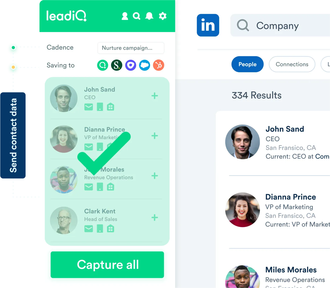 A common use case is leveraging LeadiQ’s Chrome Extension directly within LinkedIn. In just a few clicks, reps can surface critical prospect details: emails, phone numbers, job titles, company size, industry, recent news mentions, and even signals like hiring trends or podcast appearances. All of this data flows seamlessly into your CRM or engagement tools, automatically feeding the workflows and sequences your team already uses.