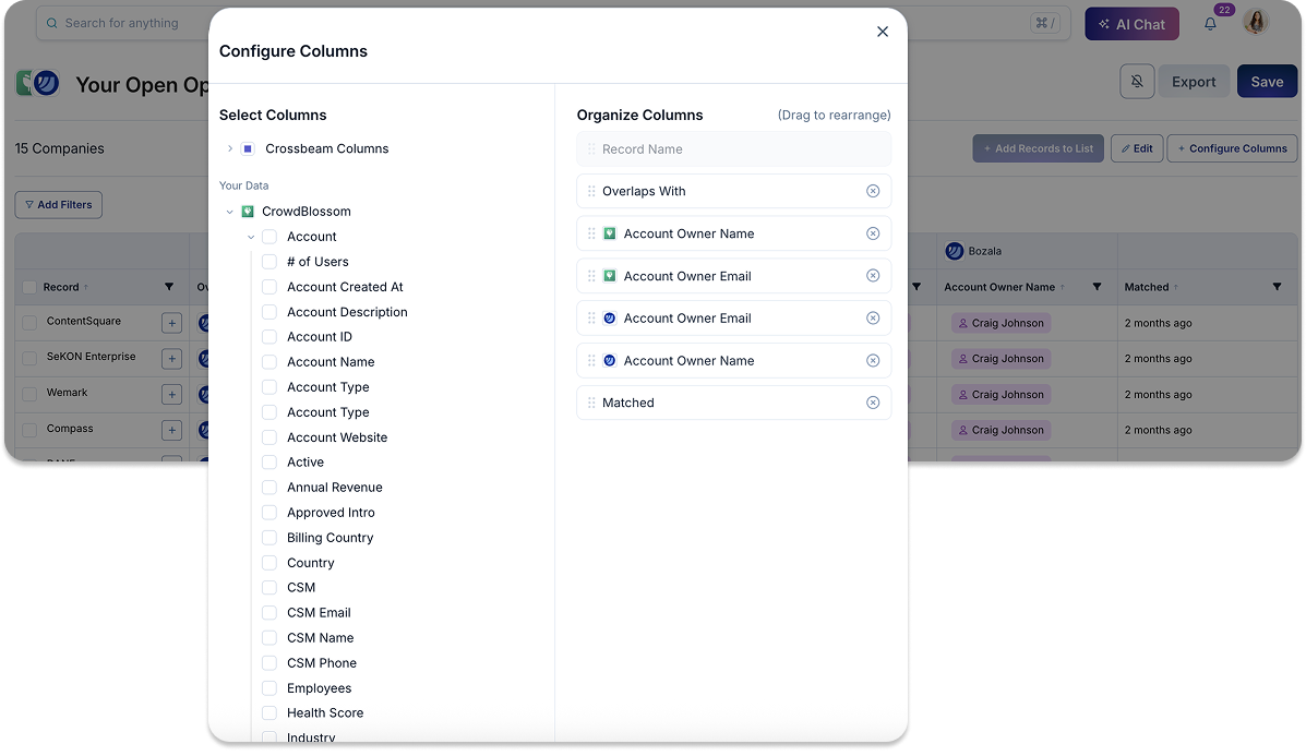 You can also enrich these reports with additional CRM data or partner-provided fields, filtering accounts by geography, integration status, intelligence flowing through LeadiQ or Gong to your CRM, or ICP fit to focus only on the highest-value opportunities.