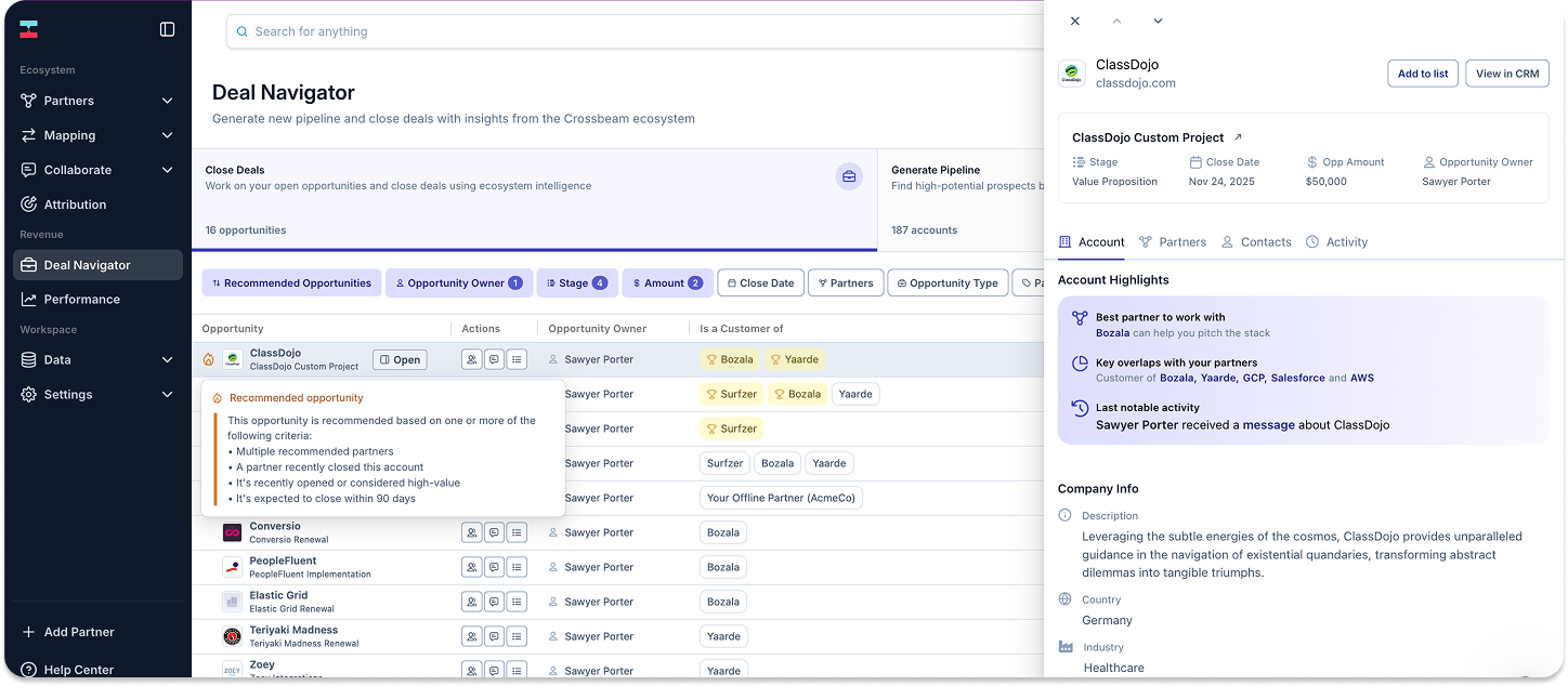Beyond mapping, Crossbeam’s Deal Navigator consolidates all partner-related intel for your open opportunities in one place, embedded directly in Salesforce or accessible via Chrome.