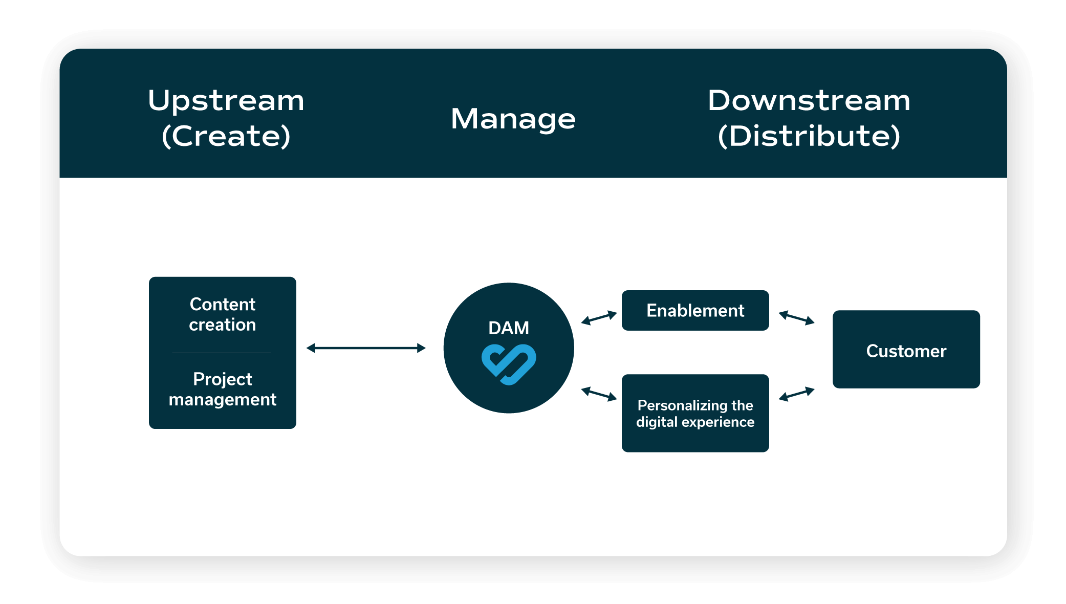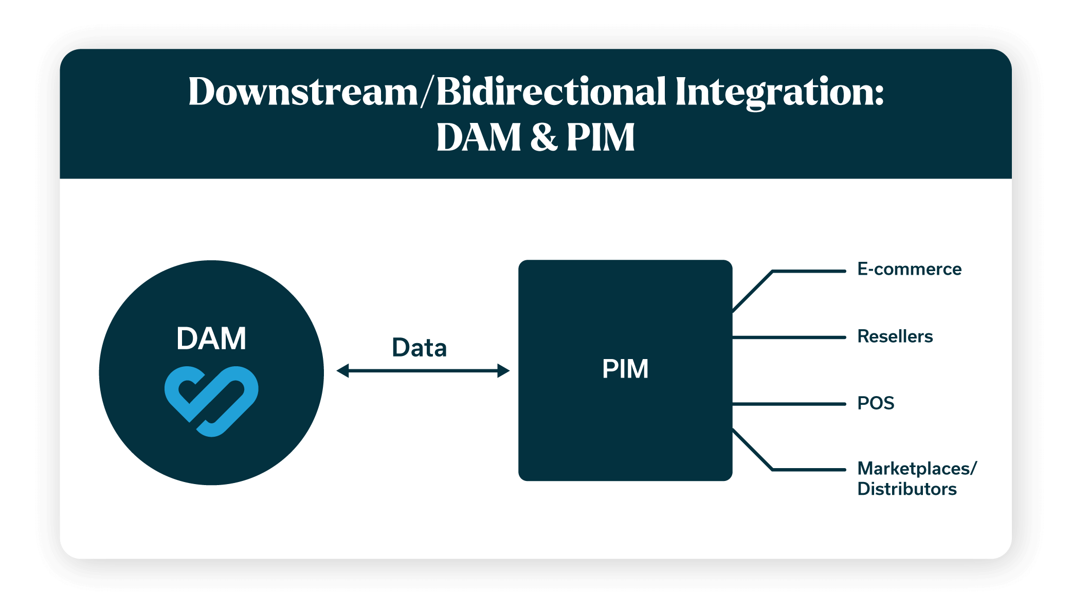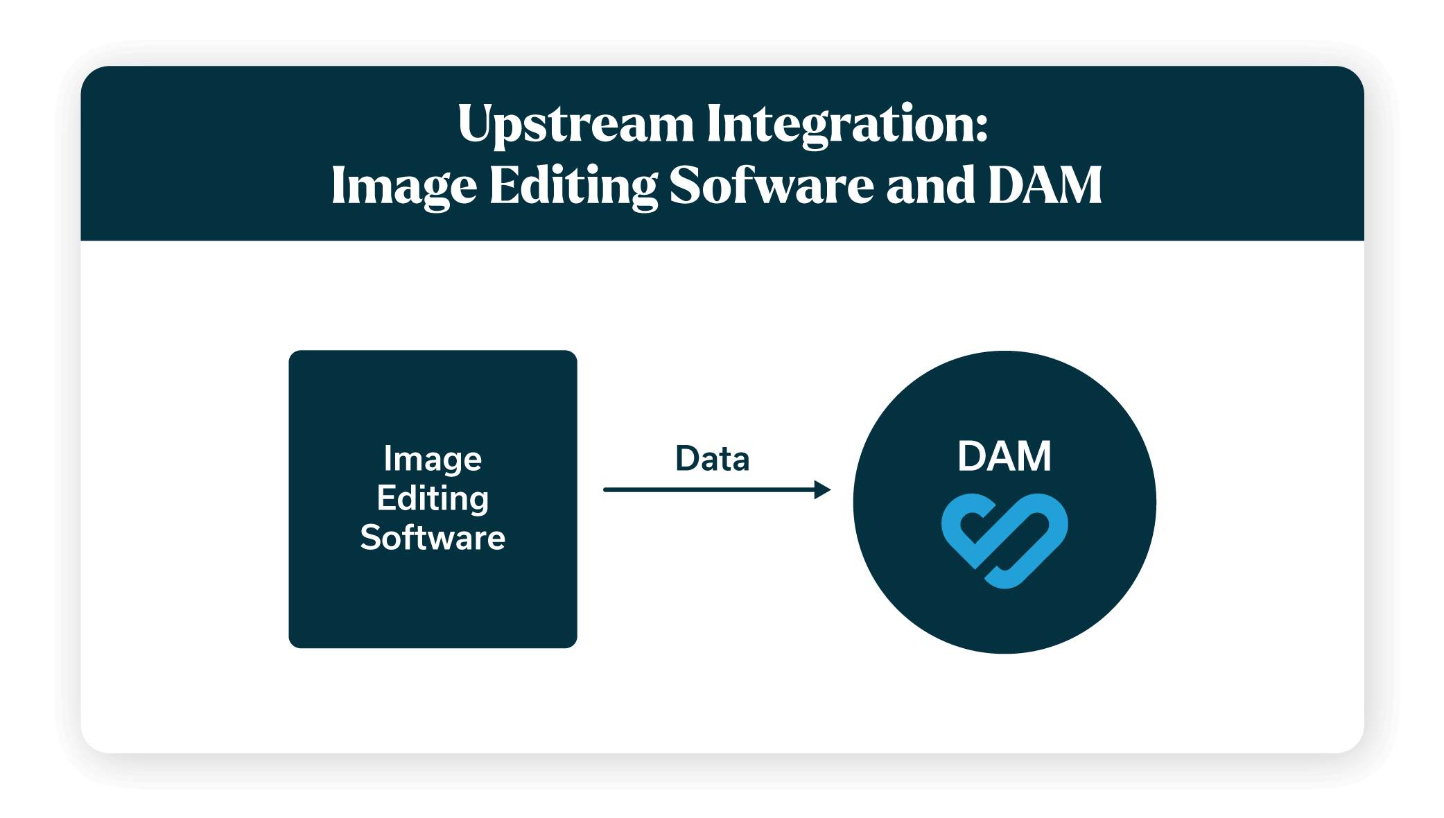 An upstream integration might entail creating digital assets, like product photos, for e-commerce sites using a content creation tool and bringing those assets into the DAM.